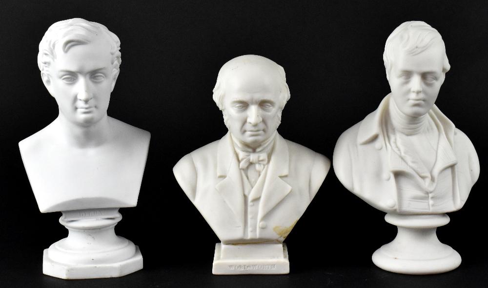 Lot 484 of 1291: Three late 19th/early 20th century Parian ware busts of Byron, Wordsworth and Burns, impressed to the back 'J & TB', height of largest 19.5cm (3).