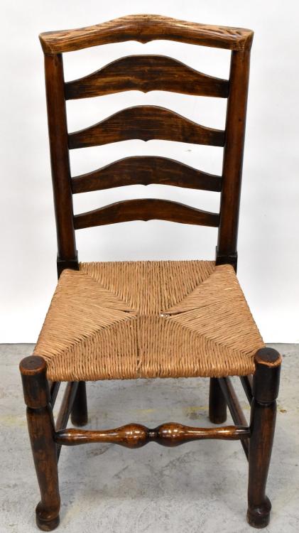 Lot 16 of 1098: A set of six 18th century ladder back rush seated chairs with four rails, on turned tapering supports united by stretchers, on pad feet (6).