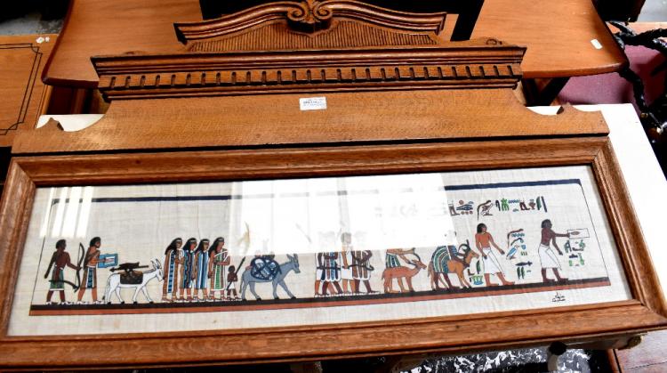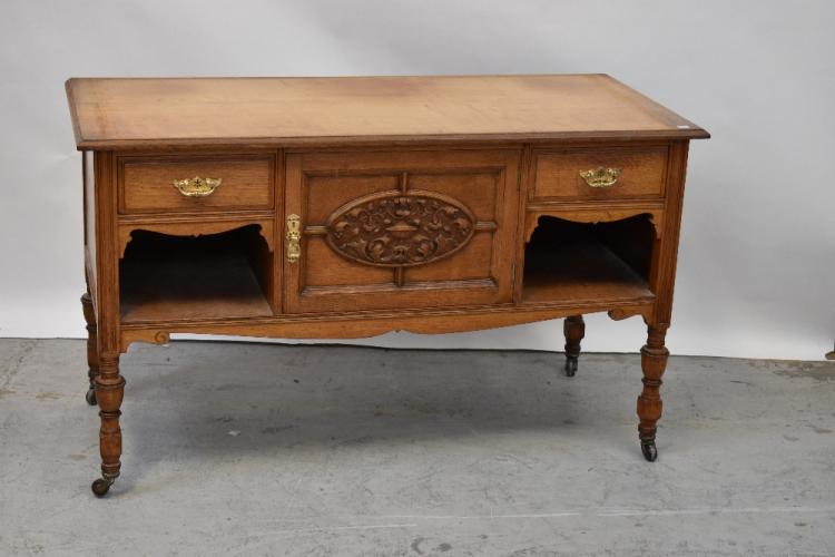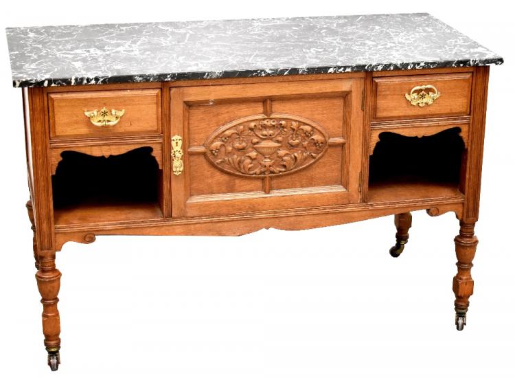 Lot 24 of 1098: An Edwardian oak bedroom suite comprising triple wardrobe with dentil moulded cornice above central section of two carved panel doors with swag and urn decoration above shelf with central turned support above pair of short drawers and three long graduated drawers, flanked by pair of shaped bevelled mirrored doors, raised on bun feet, 216 x 210 x 59cm, a marble-topped washstand with fielded panel doors centred with a carved panel with swag and urn decoration flanked by a short drawer and open she