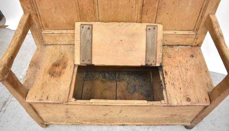 Lot 36 of 1098: An 18th century rustic pine box seat settle, the back with three fielded panels above small hinged section, raised on stile supports, 99 x 118 x 55cm.
