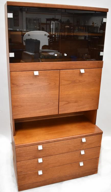 Lot 45 of 1098: A retro 1960s style glazed teak sideboard, the upper section comprising a pair of smoked glazed doors and a further single glazed door above a fall-front cocktail cabinet alongside a single panelled cupboard, above open shelf and three further doors, to plinth base, 178 x 137 x 46cm, a matching sideboard, the upper section with pair of glazed doors above pair of panelled doors and open shelf with three full-length drawers raised on a plinth base, 178 x 91 x 46cm, and a further matching low two-d
