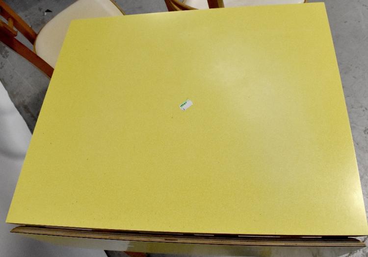 Lot 53 of 1098: A 1960s yellow Formica covered drop-leaf kitchen table raised on rounded tapering supports and a set of four bar back dining chairs (5).