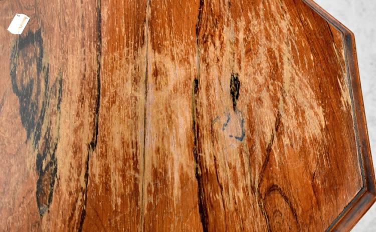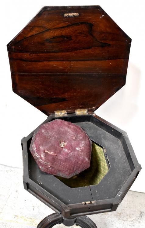 Lot 18 of 875: A 19th century mahogany octagonal sewing box with lift-out tray and interior check lining, to central baluster and tripartite support to paw feet, height 77cm, diameter 50cm.