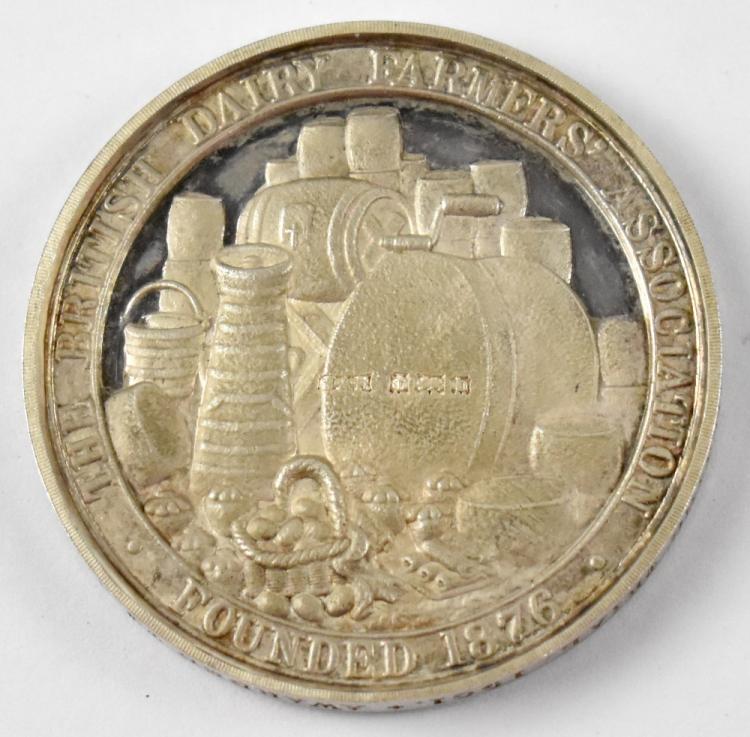 Lot 30 of 875: BRITISH DAIRY FARMERS ASSOCIATION; a late Victorian hallmarked silver medal awarded to J. P. Cross for 'Shorthorn Cow Viscountess Jersey VII in Milking Trial 1901', the medal depicting a farm scene of milk churns, buckets, kegs, cheeses and fruit to the reverse and a picture of a shorthorn cow and a goat to the front, approx 1.3ozt, in original presentation case.