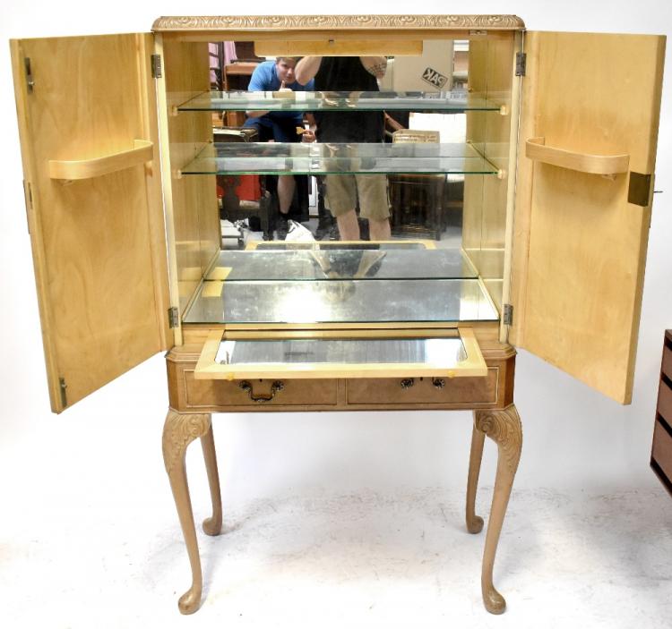 Lot 49 of 875: A modern Chinese-style walnut effect cocktail cabinet, with glass shelves, mirrored back and base, internal light, shelves to the inside of the doors, Chinese-style brass fitting to the lock, on two-drawer base to cabriole legs, 158 x 86 x 47cm.