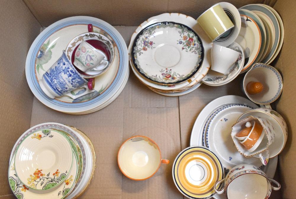 Lot 212 of 875: A large quantity of ceramics mainly 1930s-1940s, to include Masons, Susie Cooper cups, Greys Pottery cups, matching and non-matching cups, saucers, small plates, Lowestoft style ware, a white Shelley plate and small items of royal commemorative ware, a Clarice Cliff royal commemorative saucer, etc (2).