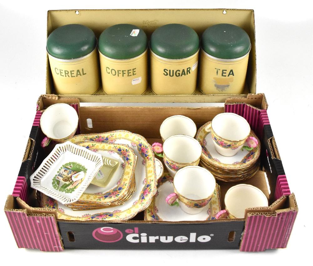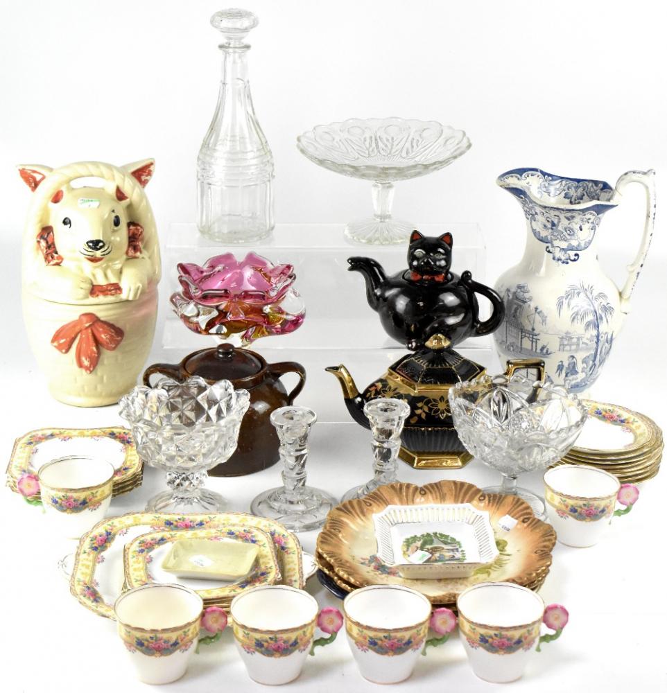 Lot 213 of 875: A quantity of mainly early 20th century ceramics and glassware to include a decanter, cranberry glass bowl, cake plate, two teapots, a large storage jar in the form of a white rabbit, cut glass candlesticks, a set of four vintage storage containers, cream ground with green tops, labelled for 'Cereal', 'Coffee', 'Sugar' and 'Tea', in metal cream wall-hanging shelf, an Aynsley floral tea service with large sandwich/cake plate, four square plates in the Art Deco style and six cups and saucers, with