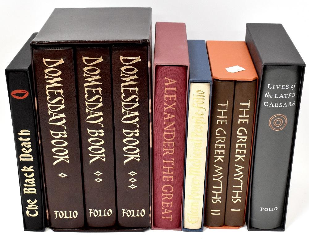 Lot 472 of 875: Folio Society; a group of historical related books all in original slip covers by various authors, 'Lives of The Later Caesars', 'The Black Death', three volumes of 'Domesday Book', 'Alexander The Great', 'Medieval People', and 'The Greek Myths' (6).
