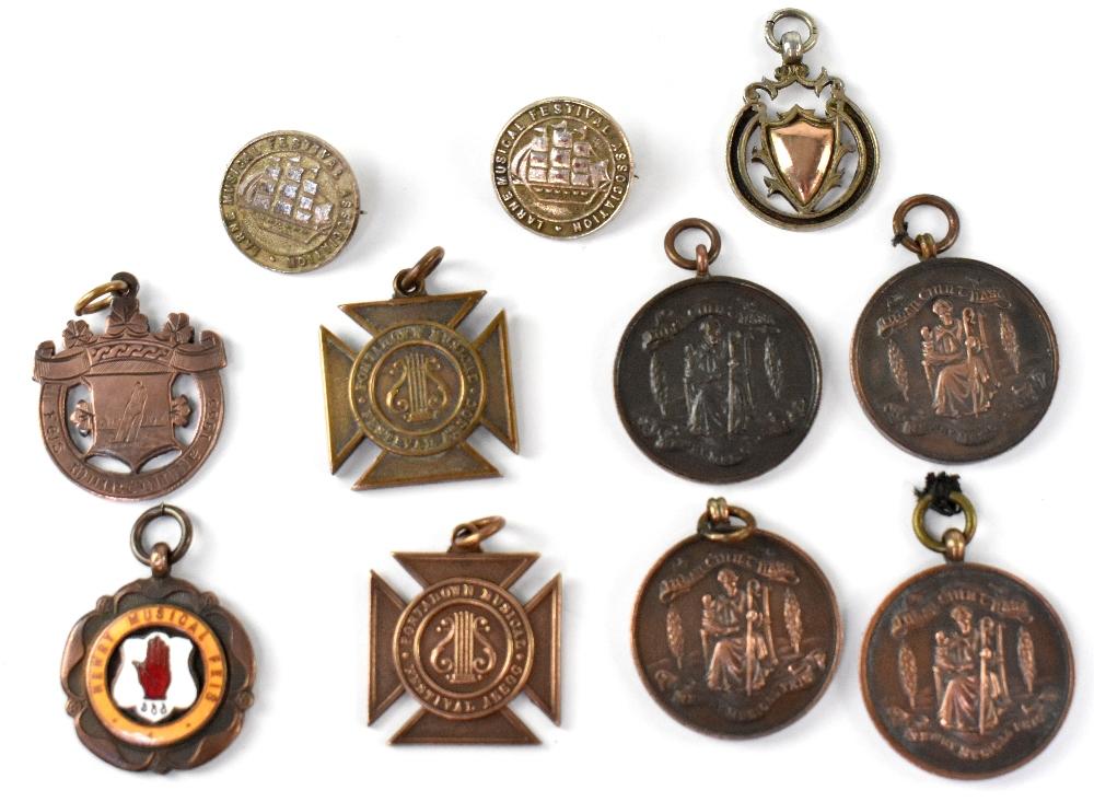 Lot 581 of 875: A group of eleven white metal and base metal music festival related medals, mainly Irish, to include Portadown Musical Society festival, Larne Musical Festival Association, Newry Festival Association and other Irish related medals (11).