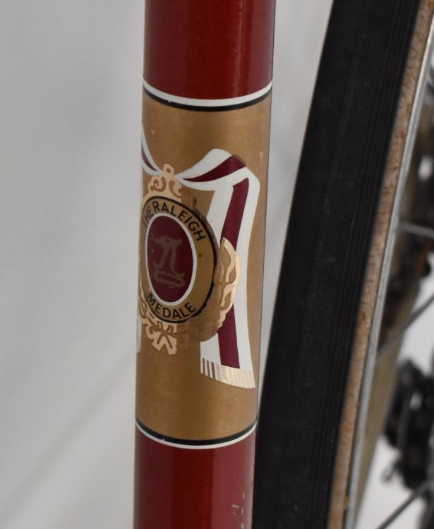 Lot 587 of 875: A vintage Raleigh Medale push bike, silvered frame with red highlights, drop handlebars and Avenir seat, 100 x 162cm.
