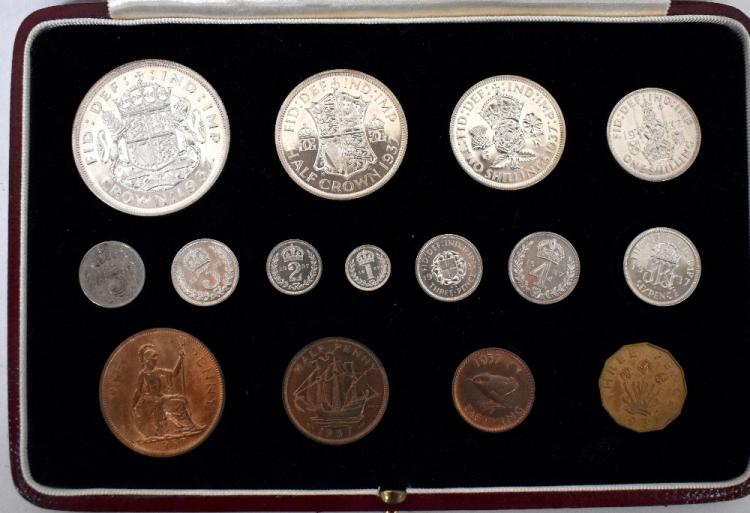 Lot 723 of 875: A George VI 1937 cased set of fifteen specimen coins to include Coronation crown, half crown, florin, shilling, shilling, Scottish shilling, sixpence, silver threepence, brass threepence, penny, half penny and farthing and four silver Maundy Money set, in dark red leather presentation box.