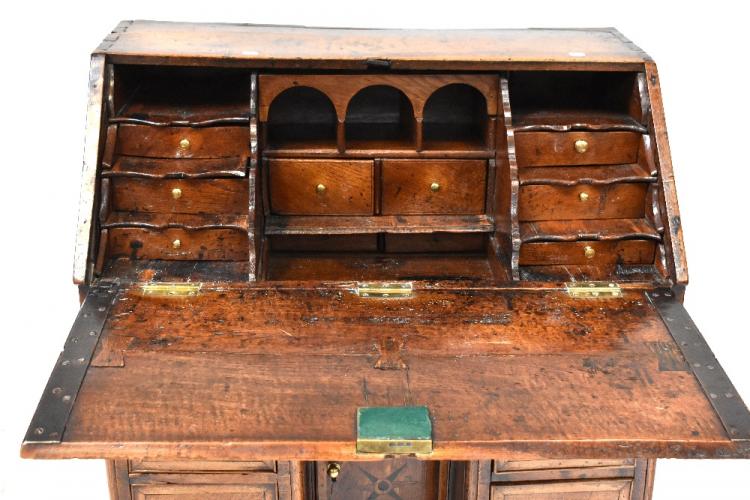 Lot 2 of 1053: A George III oak bureau, drop-down desk top, interior with arched pigeonholes and eight small drawers above one long central drawer to three drawers either side and central knee hole with small cupboard with starburst inlay, to shaped plinth base, 110 x 95 x 54cm.