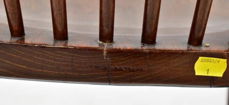 Lot 6 of 1053: A late 18th/early 19th century Windsor stick back elbow chair with solid saddle elm seat and shaped arm rests, raised on turned legs united by stretcher.