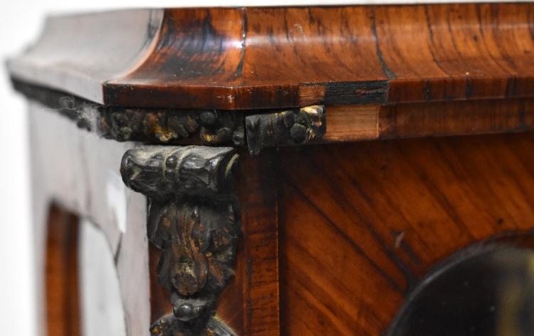 Lot 14 of 1053: A 19th century flame mahogany bonheur du jour twin glazed display cabinet with glazed panels to either side, one interior later glass shelf, chequerboard design to the base of the cabinet above four small drawers to serpentine desktop above one central drawer, to tapering cabriole supports with ormolu mounts throughout cabinet and desktop, 145 x 79 x 58cm.
