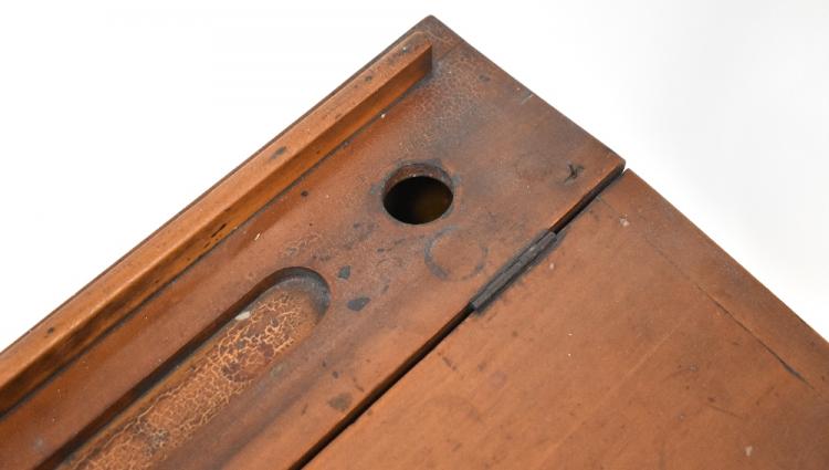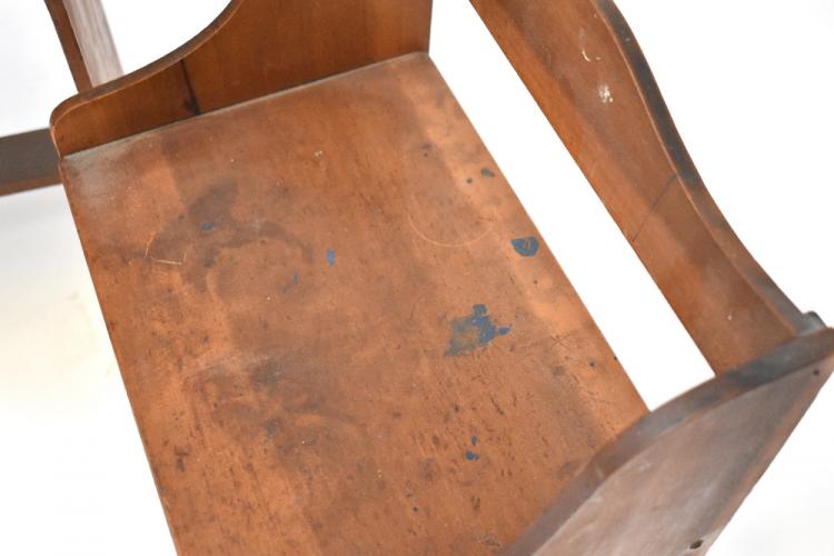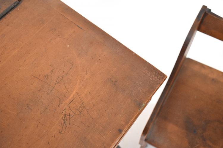 Lot 52 of 1053: An early 20th century child's desk with push-under seat, inkwell hole and pen rest to the top of the desk, lift-up desk to block supports, 64 x 51 x 41cm, chair height 57cm (2).