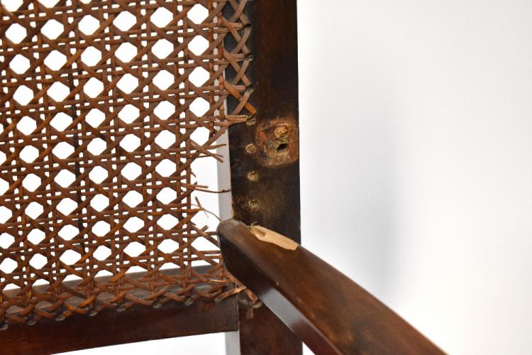 Lot 63 of 1053: An Edwardian oak two tier-tea trolley, various vintage trays and an Edwardian armchair with bergère back and outswept arms to tapering cabriole supports (af) (4).