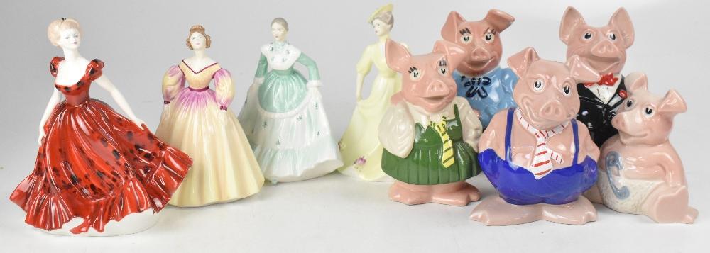 Lot 346 of 1053: A set of five Wade NatWest pig money banks and four Coalport 'Ladies of Fashion' comprising 'Beverley', 'Stephanie', 'Diana' and 'Rosalea' (9).