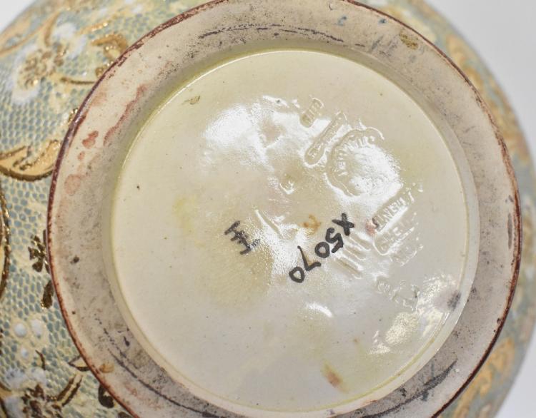Lot 353 of 1053: ROYAL DOULTON; a large baluster vase, cream ground with gilded lace and floral pattern, long tapering neck with acanthus leaf gilded decoration to the base, initialled 'HH' and numbered X5070, height 43cm.