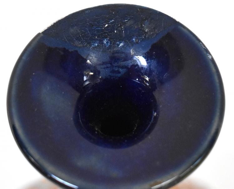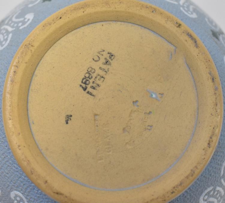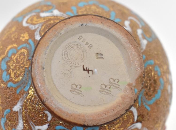 Lot 354 of 1053: ROYAL DOULTON; a baluster vase with lace pattern and floral gilt-heightened base, green drip glaze neck and cobalt blue rim, initialled to the base 'JB' numbered 8465, height 27cm and a small blue planter with sky blue base, with gilt-heightened floral decoration, impressed marks and numbered to the base 8897, diameter 13cm (2).