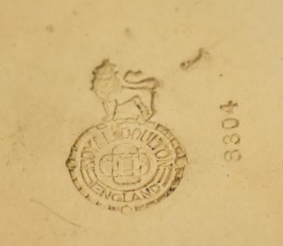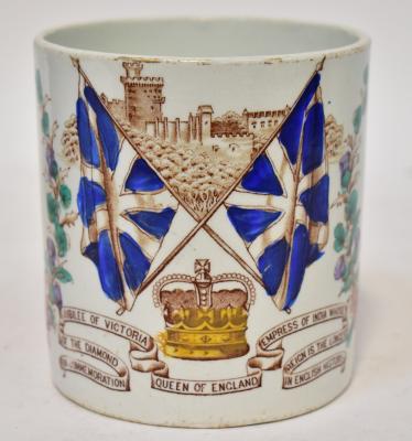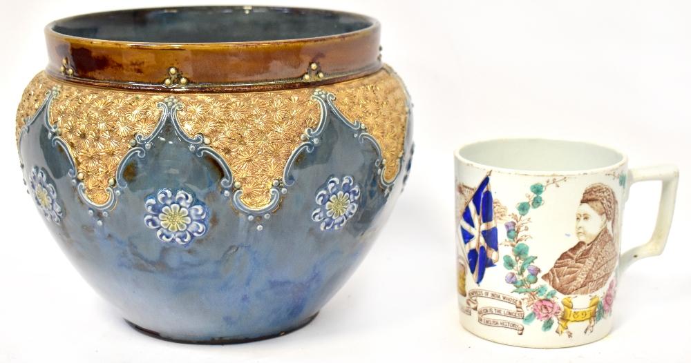 Lot 356 of 1053: ROYAL DOULTON LAMBETH POTTERY; an early 20th century Chiné ware jardinière with brown glazed rim, with interspersed groups of three small jewels, the tapered baluster body with a ring of shaped panels of gilt circle decoration, on a blue ground with embossed flowers, Royal Doulton impressed factory mark to the base with the assistant's initials for Minnie Webb, height 19cm, diameter approx 23cm and a 19th century Queen Victoria Diamond Jubilee commemorative mug bearing the portrait of the young