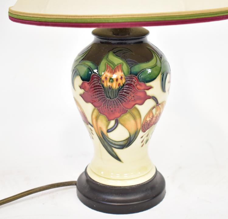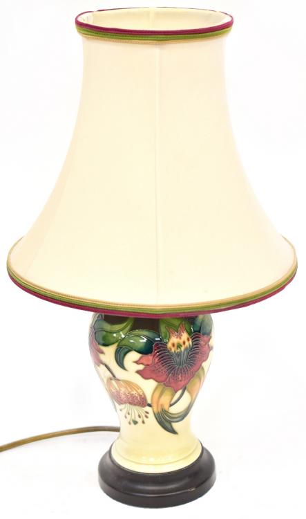 Lot 364 of 1053: MOORCOFT; an 'Anna Lily' pattern pottery lamp with tube lined decoration, of baluster shape on wooden plinth, with matching shade, height to top of shade 41cm, height of lamp body 17cm.