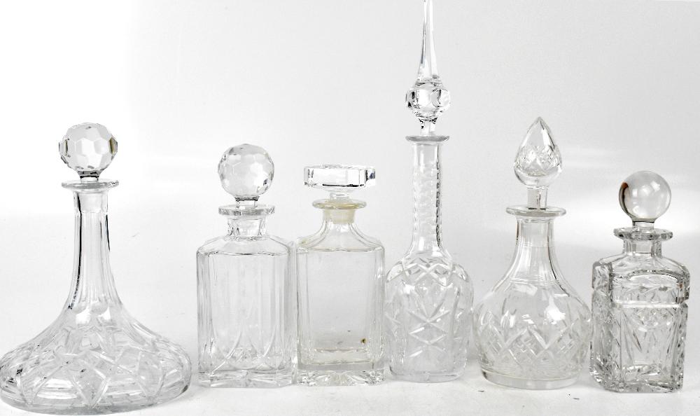 Lot 369 of 1053: Six 20th century cut glass decanters comprising three square decanters, a globular decanter, a ship's decanter and one other (6).