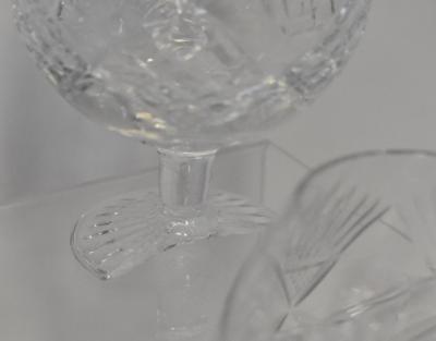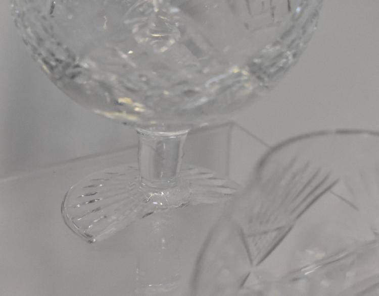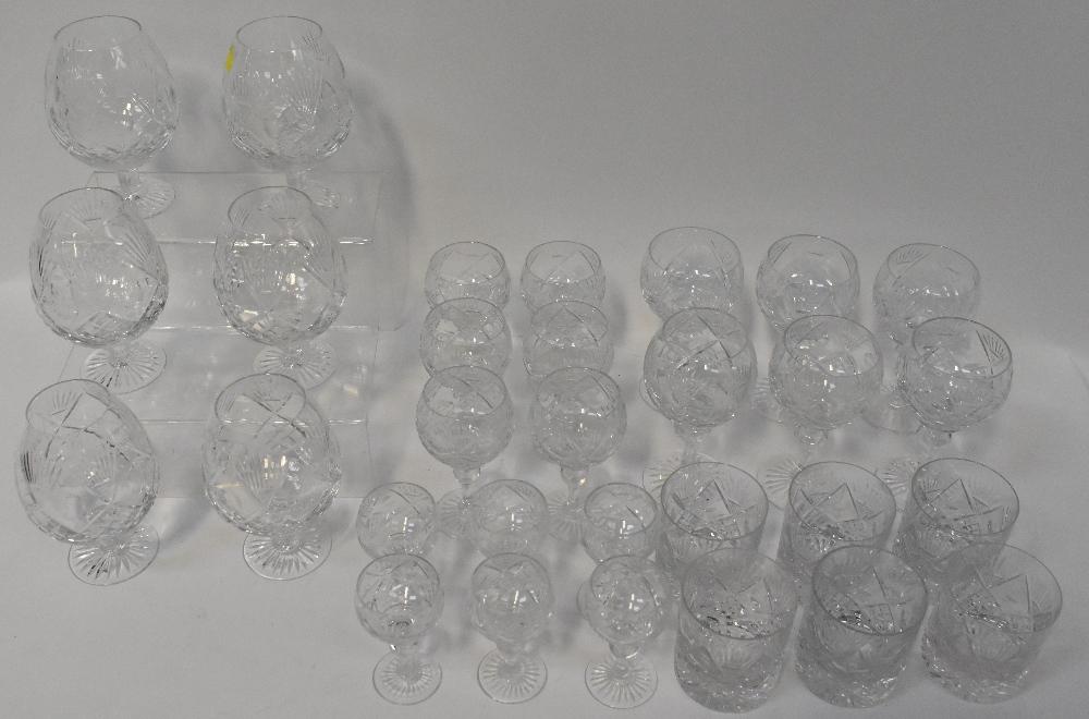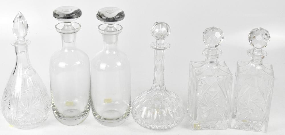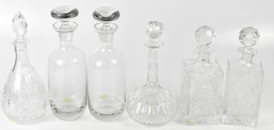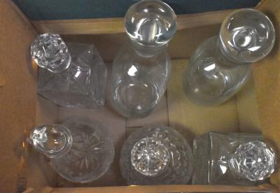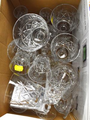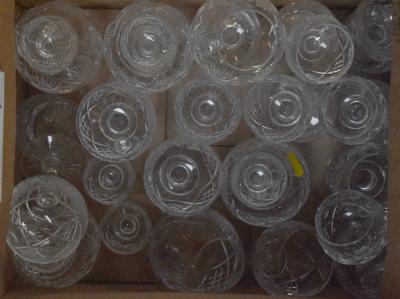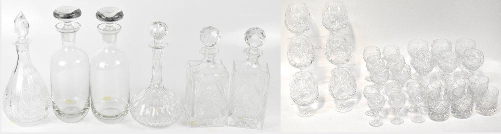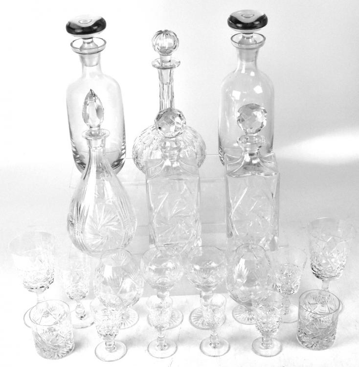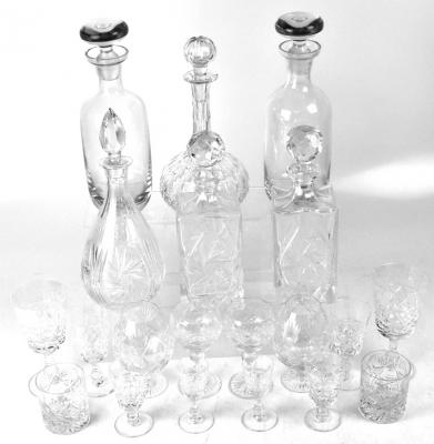 Lot 382 of 1053: A quantity of good cut and plain crystal glassware to include two modern clear crystal decanters of cylindrical form with polished thick base and squashed stopper, height 32cm, a pair of good quality square cut glass crystal decanters with polished cut star cut square base with gold ball style stoppers, 27 x 9 x 9cm, one of onion shape with multi-facet cut neck, to lens cut body with cross cut lower border, polished base with multi-star cut base and globular star cut stopper, a club shaped decan