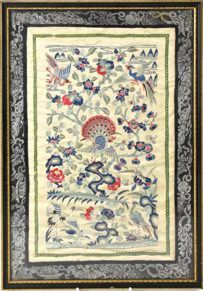 Lot 384 of 1053: An Oriental embroidered silk panel of birds amongst flowers, within simple border, 41 x 28cm, framed and glazed.