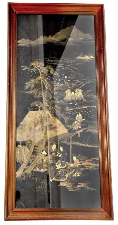 Lot 385 of 1053: A large Oriental embroidered panel depicting farm workers in the foreground with fields and mountains beyond, 130 x 56cm, framed and glazed.