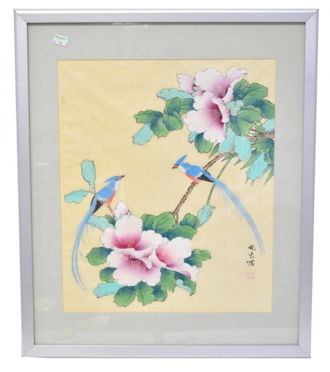 Lot 386 of 1053: An early 20th century gouache on silk of exotic birds in floral setting, signed lower right, 47 x 39cm, framed and glazed.