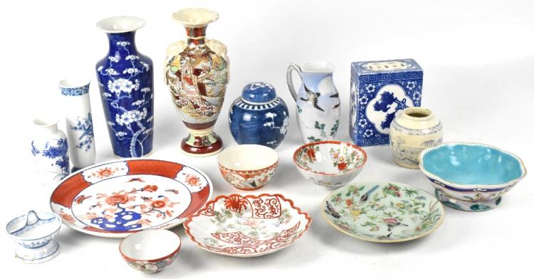 Lot 389 of 1053: Mixed Oriental ware comprising a modern cherry blossom covered ginger jar, a similar vase, a Famille Verte plate, Japanese Satsuma vase and various plates, bowls, tea bowls, vases, etc (16).