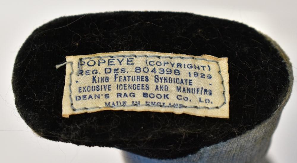 Lot 720 of 1053: DEAN'S RAGBOOK DOLL; a velvet doll with printed facial detail, stitched body depicting 'Popeye the Sailor Man' from the vintage cartoon series (lacking pipe).