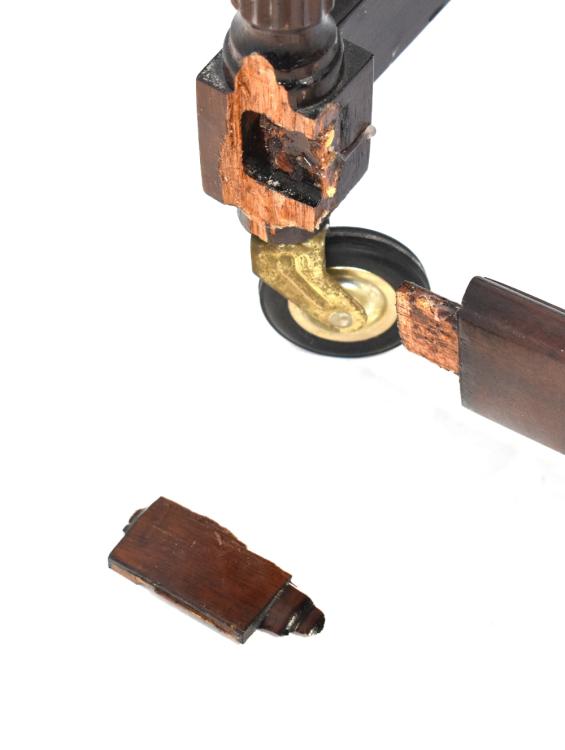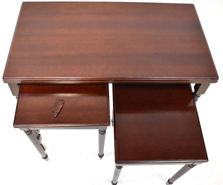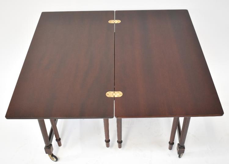 Lot 31A of 998: A modern mahogany fold-over tea table trolley containing two smaller square section occasional tables, all with reeded supports, 60 x 74 x 41cm (af).
