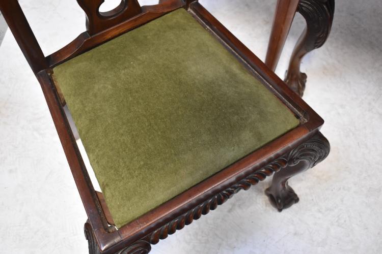 Lot 44A of 998: A reproduction mahogany extending dining table containing a single pop-up leaf, on tapering supports and brass castors, and a set of four Chippendale-style dining chairs with carved frieze detail, raised on cabriole legs to ball and claw feet (5).