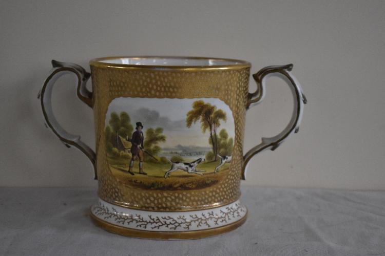 Lot 11 of 142: A large mid-19th century English hand-painted loving cup, the front decorated with a huntsman out with his hounds, the reverse a bird upon a branch, overall set on a heavily gilded ground, height 15cm, length 24cm (af).