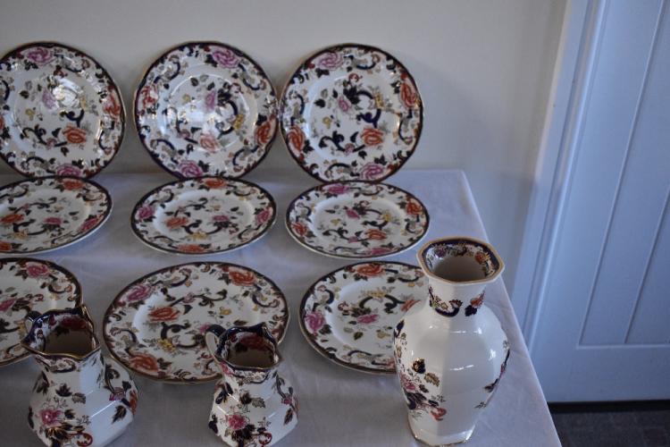 Lot 16 of 142: MASONS; a quantity of Mandalay ironstone ceramics, comprising three jugs, lidded canister, ginger jar and cover, vase and twelve assorted plates.
