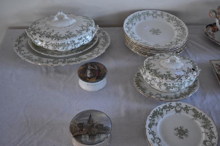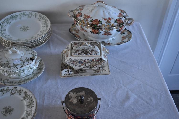 Lot 26 of 142: A group of Victorian ceramics, including a Ridgeways 'Old Derby' biscuit barrel, two pot lids 'Church of the Holy Trinity, Stratford on Avon' and 'If ever I plant in that boosom a thorn', a rectangular sauce tureen cover and stand, oval tureen and a small selection of green floral decorated dinner ware.