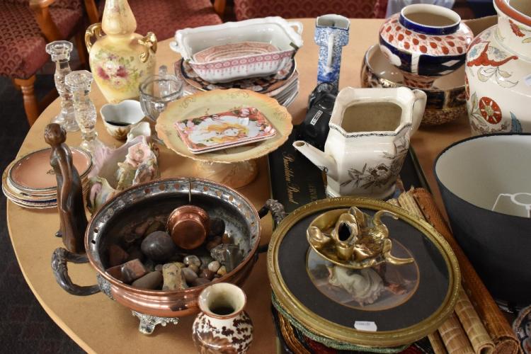 Lot 29 of 142: A large quantity of decorative ceramics including table lamps, large vase, blush ivory vase, also a copper twin handled bowl, wooden lamp, etc.