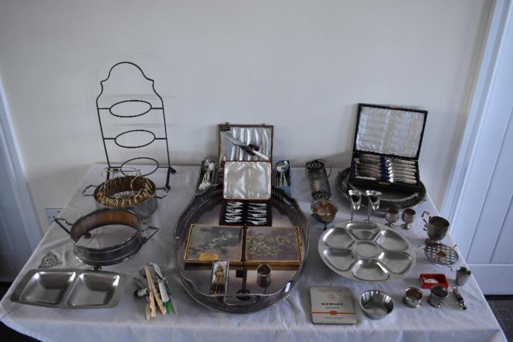 Lot 36 of 142: A silver plated twin handled oval galleried tray, a plated salver, plated cutlery, also mixed metalware (quantity).