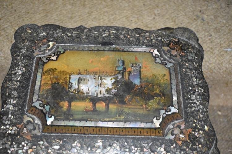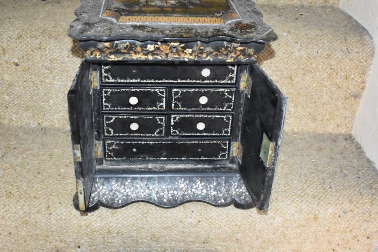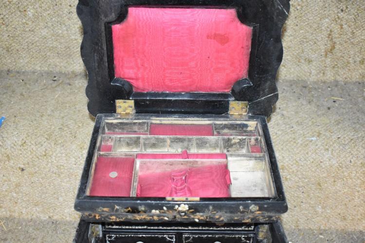 Lot 46 of 142: A Victorian papier-mâché and mother of pearl inlaid table top cabinet with hinged lid enclosing a compartmentalised tray and with twin doors enclosing six drawers, width 28cm, and three further boxes for restoration (4).