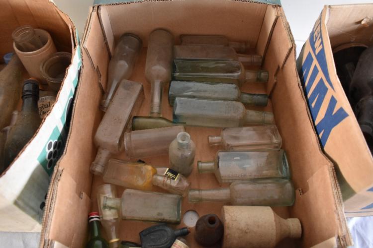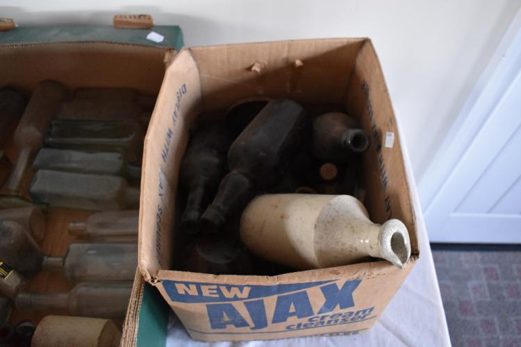 Lot 49 of 142: A group of bottles, predominantly vintage glass, also a some stoneware, names including Mew Ross, HP Sauce, Marston's, etc.