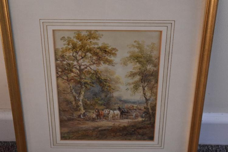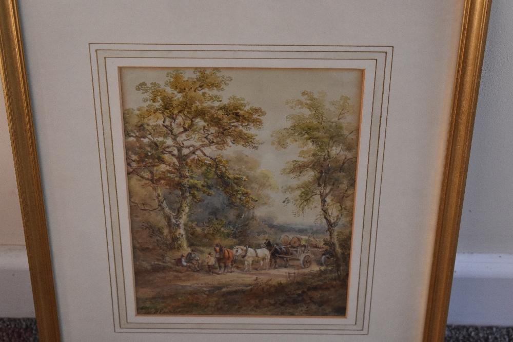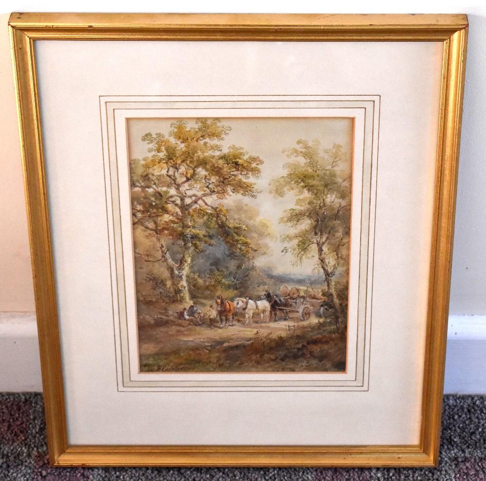 Lot 64 of 142: HENRY EARP SENIOR (1831-1914); watercolour, rural landscape with figures resting beside a horse-drawn cart on a path, signed 24.25 x 17.5cm, framed and glazed.