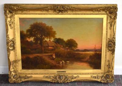 Lot 66 of 142: HENRY MAIDMENT (FL.1885-1914); oil on relined canvas, rural landscape with figure and dog before a duck pond with thatched cottage beyond, signed with initials lower left, 50 x 75cm, framed.