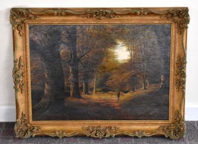 Lot 68 of 142: ALFRED FONTVILLE DE BREANSKI (1877-1955); oil on canvas, a huntsman in a woodland landscape with his hound, signed lower left, 46 x 64cm, framed.