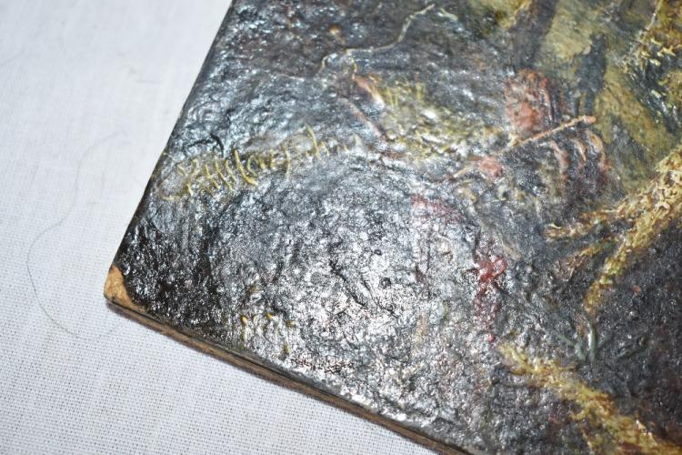 Lot 69 of 142: R.H. HAZVECHIO; oil on card, rural landscape with figures on a path in foreground, signed and dated 1878, 18 x 26cm, framed.