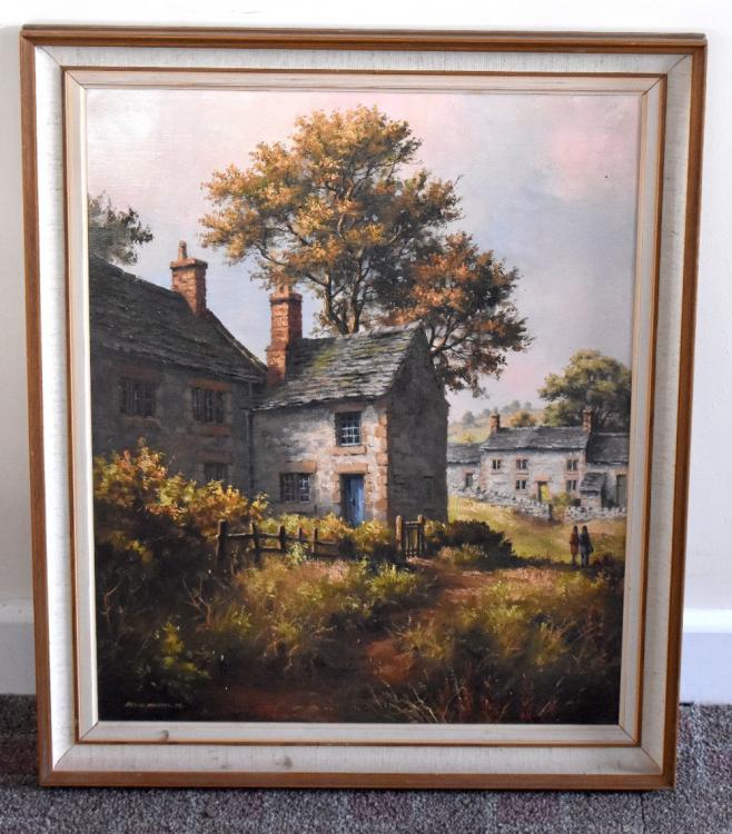 Lot 71 of 142: REX N. PRESTON (born 1948); oil on canvas, farmstead with two figures on a path, signed and dated '75, 55 x 45cm, framed. (D)