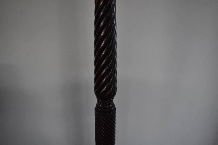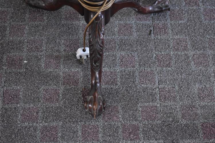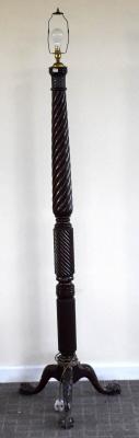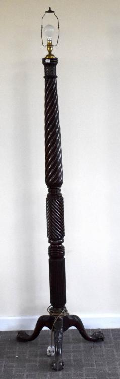 Lot 81 of 142: A large early 20th mahogany standard lamp with wrythen twisted column to three floral knee carved swept supports on ball and claw feet.