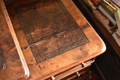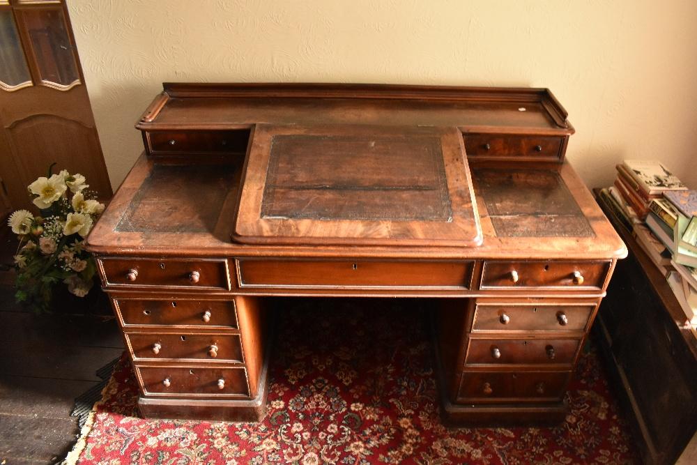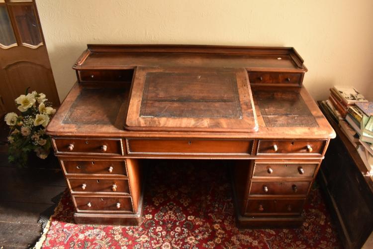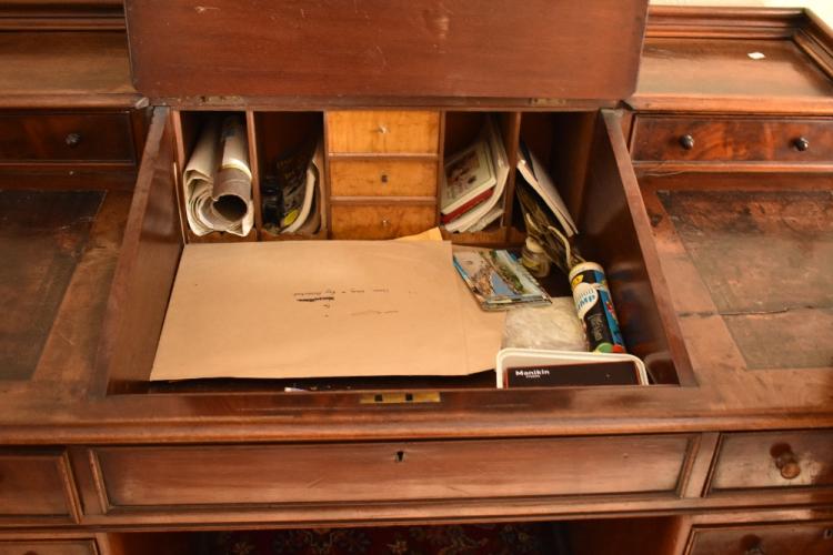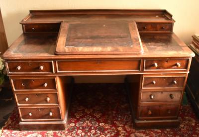 Lot 82 of 142: A Victorian mahogany Dickens desk, the raised back with three quarter gallery above two short drawers and hinged fall enclosing further drawers and pigeonholes, flanked by two banks of four short graduated drawers to a plinth base, height 92cm, width 153cm, depth 82cm.
