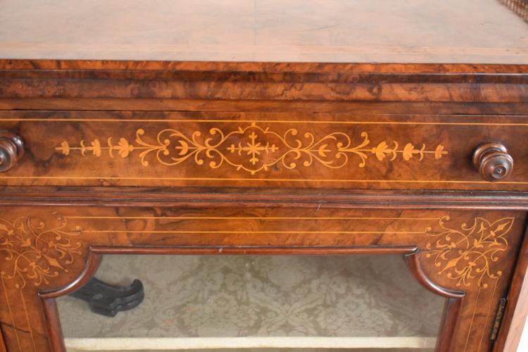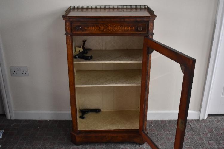 Lot 85 of 142: A Victorian figured walnut and inlaid pier cabinet with three quarter brass gallery above single drawer and glazed cupboard door above a plinth base, height 101cm, width 61cm, depth 37cm.