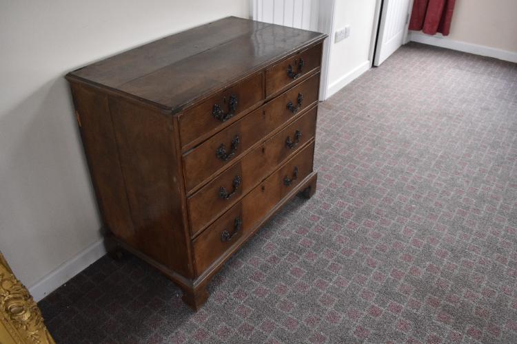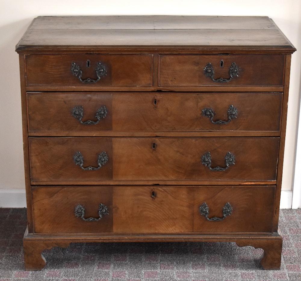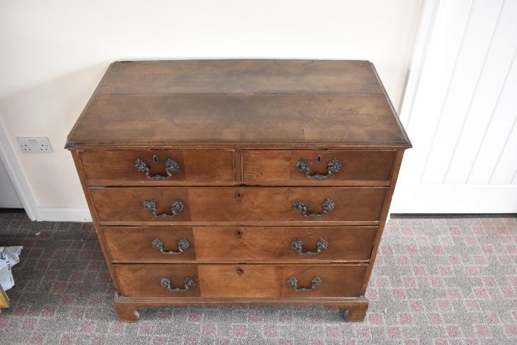 Lot 90 of 142: A late 18th century walnut cross-banded chest of two short and three long graduated drawers raised on bracket feet, height 90cm, width 100cm, depth 54.5cm (af).